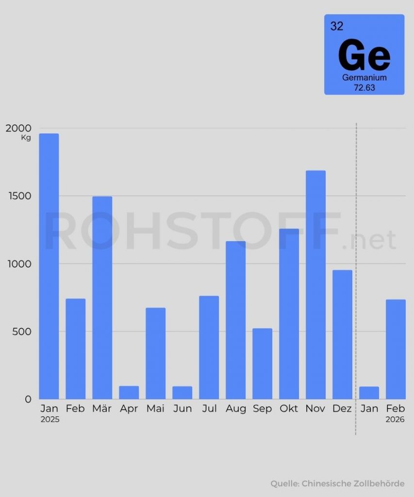 Auffällig ist die starke Konzentration der Lieferströme: Deutschland war im Januar und Februar der einzige Abnehmer von Gallium und erhielt 6.000 beziehungsweise 5.000 Kilogramm. Die Germaniumexporte brachen im Januar auf nur noch 93 Kilogramm ein – ein Rückgang um rund 95 Prozent gegenüber dem Vorjahr. Geliefert wurde in diesem Zeitraum lediglich an Kasachstan, Südkorea, die Türkei und Taiwan.